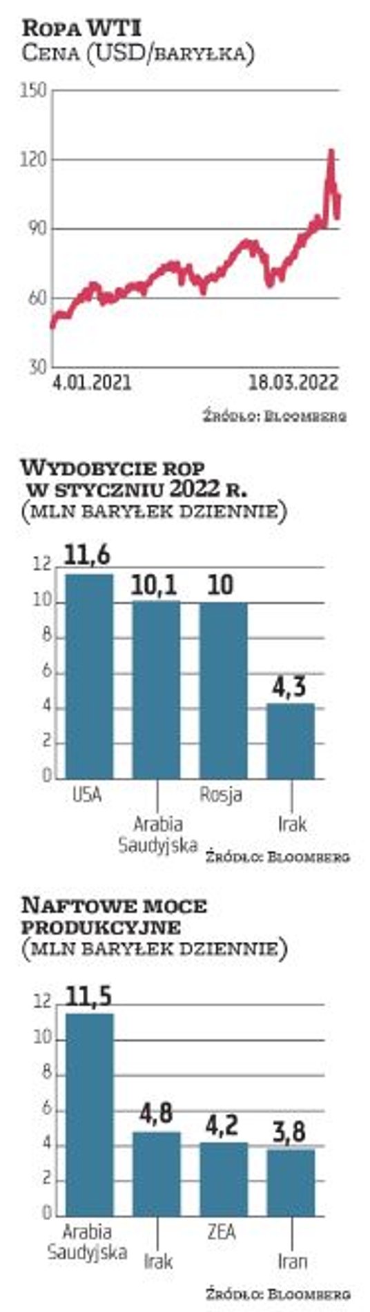 Niektóre z tych państw już i tak zbliżyły się do pełnego wykorzystania mocy wydobywczych. Na przykład Kuwejt produkował w lutym 2,62 mln baryłek dziennie, a jego moce oceniano na 2,72 mln baryłek dziennie. Są też jednak państwa, które są w stanie znacząco zwiększyć produkcję. Zjednoczone Emiraty Arabskie mogłyby ją podnieść z 2,96 mln baryłek dziennie do 4,2 mln, a Arabia Saudyjska z 10,17 mln baryłek dziennie do 11,5 mln. Razem dałoby to już 2,5 mln baryłek dziennie. Problem jednak w tym, że ani Arabia Saudyjska, ani ZEA nie chcą obecnie zwiększać wydobycia. Prezydent USA Joe Biden próbował w ostatnich tygodniach namawiać do tego księcia Mohammeda bin Salmana, saudyjskiego następcę tronu. On jednak „nie znalazł czasu" na rozmowę z amerykańskim prezydentem, podobnie jak monarchowie z ZEA. Być może to tylko ich taktyka negocjacyjna, ale nie da się ukryć, że od objęcia władzy przez Bidena relacje USA z obiema monarchiami mocno się ochłodziły. Biden wszak obiecywał, że uczyni z Arabii Saudyjskiej międzynarodowego „pariasa", za to, że królestwo to zabija dysydentów politycznych. Złym znakiem dla Amerykanów jest to, że Saudyjczycy jednocześnie ocieplają swoje relacje z Chinami. Mają nawet rozmawiać z Pekinem o tym, by część handlu ropą rozliczać w juanach, a nie w dolarach.