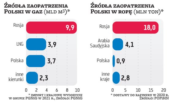 – W mojej ocenie deklaracja rządu dotycząca przedstawiania w tym tygodniu planu odejścia Polski od rosyjskich węglowodorów będzie bardziej swoistą mapą drogową, jak ten cel zrealizować w najbliższych kwartałach, niż deklaracją nałożenia na nie jednostronnego embarga – uważa Kamil Kliszcz, analityk BM mBanku. Jego zdaniem stosunkowo prosta wydaje się sprawa z gazem, gdyż kontrakt jamalski obowiązuje jeszcze tylko do końca tego roku. Po tym terminie PGNiG nie zamierza importować błękitnego paliwa z Rosji, o czym już wielokrotnie informowało. Gdyby Polska chciała wcześniej zrezygnować z dostaw, musiałaby się liczyć z koniecznością zapłaty miliardów złoty kary. Dodatkowo narażałaby się na ryzyko problemów z zastąpieniem rosyjskiego surowca alternatywnym importem, zwłaszcza jeśli doszłoby do opóźnień w budowie Baltic Pipe. Gazociąg ten ma powstać do końca roku i umożliwić docelowo import do 10 mld m sześc. błękitnego paliwa rocznie z norweskich złóż. Mniej więcej tyle wynosi teraz import ze Wschodu.