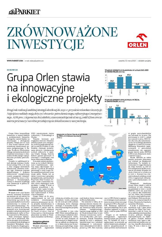 Grupa Orlen intensyfikuje inwestycje w niemal każdym z podstawowych biznesów. Szczególny nacisk kładzie na innowacyjne i ekologiczne projekty. Dzięki nim do 2030 r. chce zostać liderem zrównoważonej transformacji systemu energetycznego w Europie Środkowo-Wschodniej. Dlatego też zamierza skokowo zwiększyć inwestycje w odnawialne źródła energii i specjalistyczne produkty petrochemiczne.