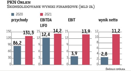 W 2021 roku grupa Orlen wypracowała 11,2 mld zł zysku netto. To o około 1 mld zł mniej, niż informowano po publikacji wyników za cztery kwartały. Mimo to nadal są one najwyższe w historii koncernu. Największy wpływ na osiągnięte rezultaty miały biznesy: petrochemiczny, energetyczny i rafineryjny.