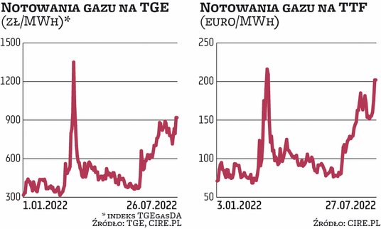Podobnie sytuacja wygląda w Polsce. W środę kurs gazu w transakcjach natychmiastowych wynosił na TGE 1035,75 zł za 1 MWh, a półtora miesiąca wcześniej nie przekraczał 400 zł. W przypadku obu giełd mieliśmy do czynienia ze względną stabilizacją cen przez niemal cały maj i połowę czerwca. Zwyżki odnotowywane w ostatnich tygodniach to oczywiście konsekwencja szantażu stosowanego przez Rosję w zakresie dostaw surowca do Europy i braku dla nich istotnej alternatywy.
