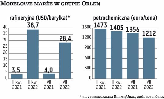 Mimo to kondycja koncernu jest wyjątkowo dobra. – W mojej ocenie wyniki finansowe grupy Orlen oczyszczone ze zdarzeń jednorazowych były w II kwartale rekordowe. Koncern szczególnie dużo zarobił w biznesie rafineryjnym, co widać było w wysokich marżach osiąganych w tym czasie – mówi Krzysztof Pado, analityk DM BDM. Dodaje, że wysokie marże nadal uzyskiwano także na działalności obejmującej produkcję petrochemiczną. Ponadto do wzrostu zysków powinien przyczynić się biznes energetyczny.