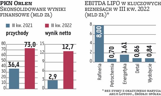 W najbliższych kwartałach Orlen liczy na przejściowy wzrost marż rafineryjnych w Europie, do czego ma się przyczynić zwyżka popytu na diesla. Zwiększone zapotrzebowanie zgłasza energetyka, która wykorzystuje to paliwo jako substytut gazu ziemnego. Z ostatnich danych wynika, że marża rafineryjna koncernu w samym październiku wynosiła aż 31,4 USD na baryłce. Tym samym była ponadpięciokrotnie wyższa niż zanotowana rok wcześniej i prawie dwukrotnie wyższa niż miesiąc wcześniej. Z kolei w całym 2022 r. wyższy jej poziom odnotowano tylko w czerwcu.