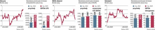 Zwraca jednocześnie uwagę, że w ujęciu rok do roku wyniki obu koncernów są nieporównywalne. W przypadku Orlenu jest to konsekwencja tego, że koncern dopiero od 1 sierpnia 2022 r. konsoliduje wyniki finansowe dawnego Lotosu, a od 2 listopada danego PGNiG. Z kolei na rezultaty grupy kapitałowej MOL duży wpływ ma wysoki podatek od ponadwymiarowych zysków. Ponadto trzeba pamiętać, że rok temu w obu koncernach wpracowano rekordowe zyski. W efekcie analityk BM mBanku szacuje, że w II kwartale płocki koncern zanotował 9,7 mld zł EBITDA LIFO. W I kwartale było to 17,2 mld zł, a rok wcześniej 5,3 mld zł. Z kolei kluczowy wskaźnik w grupie MOL, czyli oczyszczony wynik CSS EBITDA, prawdopodobnie wyniósł 131 mld HUF (forinty). W I kwartale było to 259 mld forintów, a rok temu 486 mld forintów.