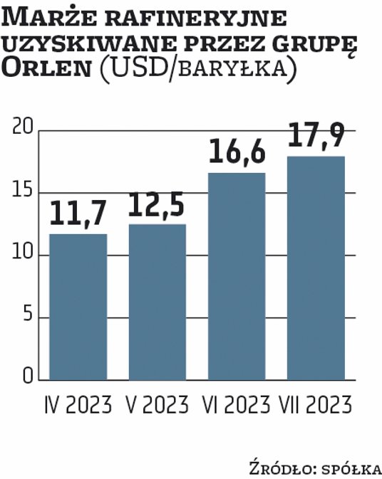 Kliszcz dodaje, że osiągana przez Orlen marża rafineryjna może być nieco niższa niż średnia europejska, gdyż w Polsce spadła premia lądowa, czyli różnica między cenami paliw obowiązującymi na międzynarodowych rynkach hurtowych a osiąganymi wewnątrz kraju. Do zamknięcia tego numeru „Parkietu” koncern nie podał, jaki poziom marży rafineryjnej zanotował w sierpniu. Wiadomo natomiast, że w lipcu wynosiła 17,9 dol. wobec 16,6 dol. w czerwcu oraz odpowiednio 12,5 dol. i 11,7 dol. w maju i kwietniu. Osiągnięte w II kwartale marże rafineryjne przyczyniły się do wypracowania w tym czasie przez grupę 2,5 mld zł zysku EBITDA LIFO w biznesie rafineryjnym. Był on znacznie niższy rok wcześniej (4,7 mld zł), mimo że wówczas rafineria gdańska działała jeszcze jako niezależny podmiot. Co ciekawe, kilkanaście dni temu Orlen podawał, że oczekuje w tym roku marż rafineryjnych na poziomie około 15 dol. To i tak dużo, gdyż w maju szacował je na 11 dol.
