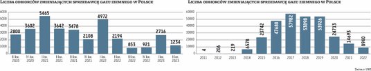 W II kwartale sprzedawcę gazu ziemnego zmieniło w Polsce zaledwie 1,2 tys. odbiorców, a w I kwartale – 2,7 tys. To niewielkie liczby. Wystarczy zauważyć, że jeszcze w latach 2016–2020 umowy z nowymi sprzedawcami zawierało kwartalnie kilkanaście tysięcy odbiorców błękitnego paliwa. W tym kontekście jeszcze lepiej skalę problemu obrazuje fakt, że w całym 2022 r. tylko 8,9 tys. klientów zdecydowało się zmienić dostawcę. To 15 proc. tego, co w rekordowym 2017 r., a przecież 58 tys. zmieniających sprzedawcę to nie jest ogromna liczba. Dziś nad Wisłą przyłączonych do sieci gazociągowej jest blisko 7 mln odbiorców surowca wysokometanowego oraz prawie 0,4 mln zaazotowanego.