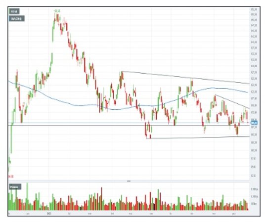 Od około sześciu miesięcy miedziowa spółka porusza się w trendzie bocznym. Zakres trendu został wyznaczony szczytem z połowy kwietnia i dołkiem nieco ponad miesiąc później, kiedy notowania przebiły linię średniej dwustusesyjnej. W kolejnych tygodniach spółka próbowała wrócić ponad tę linię i kilka razy się to udało. Kurs dotarł w pobliże okolic szczytu z kwietnia na przełomie lipca i sierpnia. Można więc mówić o ukształtowaniu się formacji podwójnego szczytu. Reakcja rynku była książkowa. Kurs wrócił w okolice dołków z drugiej połowy maja. Od tego czasu zakres ruchów mocno się zawęził. Od góry barierę dla notowań stanowi krótkoterminowa linia trendu spadkowego, która bierze początek w górce z pierwszych dni września. Punktem wsparcia od dołu stał się często poziom 108 zł, przy którym już wielokrotnie nastawienie rynku wobec KGHM zmieniało się. Oczywiście kilka razy zdarzyło się też wybicie jedną półkę niżej. Wówczas spadki KGHM zatrzymywały się w strefie 104–105 zł. Kontynuacja obecnego zachowania kursu KGHM i obrona wspomnianych wyżej wsparć wyrysuje na wykresie formację trójkąta zniżkującego, z którego zwykle następuje wybicie górą. Jeśli rynek rozegra taki scenariusz, można spodziewać się powrotu notowań do górnej linii zawężającego się, kilkumiesięcznego trendu bocznego. Jeszcze wcześniej może być jednak konieczne przełamanie dwustusesyjnej średniej.