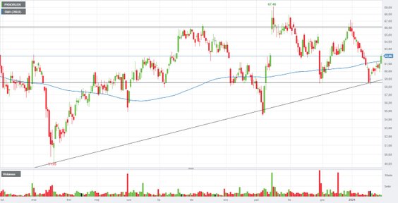 Celem kupujących powinno być teraz górne ograniczenie konsolidacji, tj. strefa między 66 a 67 zł. W tych rejonach powstał lokalny szczyt pod koniec grudnia 2023 r. Dwa miesiące wcześniej popyt również został powstrzymany w tych okolicach. Dopiero po pokonaniu wyżej wspomnianych oporów popyt będzie mógł myśleć o zmierzeniu się z rekordami z drugiej połowy 2021 r.