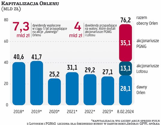 Analitycy zwracają uwagę, że Orlen jest słabo wyceniany, gdyż inwestorzy dyskontują ogromne ryzyko polityczne, jakie cały czas towarzyszy firmie. Było i nadal jest ono widoczne m.in. w kontekście fuzji z Lotosem i PGNiG. Znajduje to odzwierciedlenie także w kapitalizacji koncernu. Obecnie wartość rynkowa firmy przekracza 76 mld zł, przy czym biorąc pod uwagę tylko liczbę akcji dawnego Orlenu (sprzed połączenia), sięga jedynie 28,1 mld zł. To dużo mniej niż pięć lat temu, a więc w okresie, w którym dopiero krystalizowały się zasady, na jakich fuzje miały być realizowane (akcjonariusze dostali też w tym czasie dywidendy).