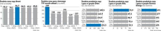 W tym kontekście warto też zwrócić uwagę na prognozowane ceny na kolejne okresy. Orlen jeszcze w maju zakładał, że w tym roku średnia cena ropy Brent będzie oscylować w pobliżu 85 USD (w całym 2023 r. było to 82,6 USD). Za takim scenariuszem miał przemawiać wzrost globalnego popytu na ten surowiec. Spadku cen oczekiwał z kolei na rynku gazu ziemnego. Szacował, że w tym roku na Towarowej Giełdzie Energii jej średni kurs będzie oscylował w pobliżu 150 zł za MWh, podczas gdy w ub.r. wynosił 202 zł. W ocenie Orlenu do zniżek miała przyczynić się wysoka podaż błękitnego paliwa spodziewana w Europie.