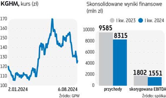 Z notowaniami miedzi cały czas mocno skorelowany jest kurs akcji KGHM-u. Przez zdecydowaną większość wtorkowej sesji wahał się w przedziale 124–125 zł. Tym samym od rekordowych 170 zł osiągniętych w maju spadał już o niespełna 30 proc. – Malejąca wycena akcji KGHM-u jest przede wszystkim efektem spadającego kursu miedzi, ale nie tylko. W ostatnich dniach mocno rośnie na świecie awersja giełdowych inwestorów do wszystkich rynków wschodzących, co powoduje wyprzedaż walorów spółki – twierdzi Maj. Powodem jest niepewna sytuacja gospodarcza i polityczna w różnych regionach naszego globu. Co więcej, może ona decydować o dalszej przecenie papierów KGHM-u, nawet jeśli spółka pochwali się lepszymi wynikami finansowymi za II kwartał od powszechnie oczekiwanych. Raport za ten okres sprawozdawczy ma opublikować już 13 sierpnia.