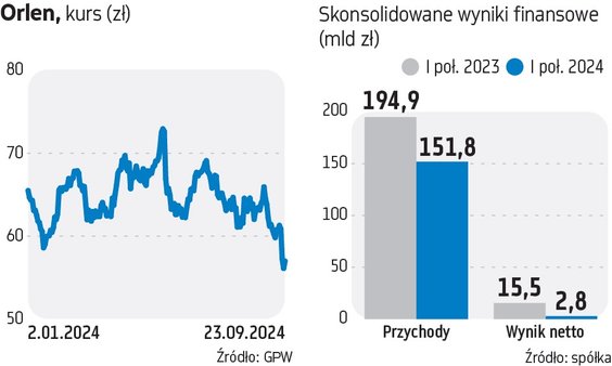 W poniedziałek i piątek kurs akcji Orlenu oscylował przez większość sesji w stosunkowo wąskich widełkach cenowych: 56–57 zł. Była to najniższa rynkowa wycena walorów spółki od prawie roku. Wpływ na obecne notowania ma oczywiście odcięcie dywidendy o wartości 4,15 zł. Prawo do niej ustalono na 20 września. Jednak nawet dziś, dodając do bieżących notowań wartość dywidendy, należy zauważyć, że kurs jest najniższy od stycznia tego roku. Dlaczego inwestorzy coraz chętniej sprzedają akcje koncernu?