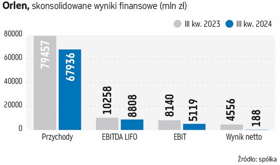 W końcówce tego roku grupa Orlen może wypracować słabsze wyniki finansowe niż rok temu. Zarząd koncernu spodziewa się zwłaszcza spadku kluczowego wskaźnika, czyli zysku EBITDA LIFO. W IV kwartale ubiegłego roku sięgał on 11,2 mld zł. Będzie to przede wszystkim efekt zniżki rezultatów osiąganych w biznesie gazu wywołanej brakiem dodatniego wpływu rekompensat oraz spadkiem marż na handlu błękitnym paliwem. Zarząd nie spodziewa się większych zmian wyników na działalności detalicznej i petrochemicznej. Wzrosty, ale umiarkowane, oczekiwane są w pozostałych trzech biznesach, czyli rafineryjnym, energetycznym i wydobywczym.