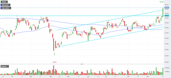 Kurs już wcześniej uporał się z 61,8-proc. zniesieniem fali spadkowej od szczytu sprzed roku i teraz ma otwartą drogę na ubiegłoroczne maksima. Możliwy jest oczywiście retest strefy wokół 142,5 zł, która teraz staje się wsparciem.