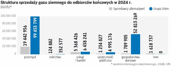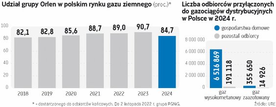 W ocenie giełdy nie stanie się tak bez zwiększenia płynności i liczby uczestników polskiego rynku. Tymczasem cały czas dominującą pozycję na nim ma grupa Orlen. Z ostatnich danych URE wynika, że w ubiegłym roku 84,7 proc. błękitnego paliwa dostarczonego do końcowych odbiorców pochodziło właśnie od tego koncernu. Podmiot ten miał też ponad 82-proc. udział w wolumenie pozyskanego gazu (zakup i wydobycie) i przeszło 85-proc. w rynku hurtowym. Jak z tego wynika dość duża liczba firm posiadających koncesję na obrót paliwami gazowymi w Polsce (było ich 185 na koniec 2024 r.) na razie w sposób istotny nie ogranicza pozycji rynkowej dominującego gracza.