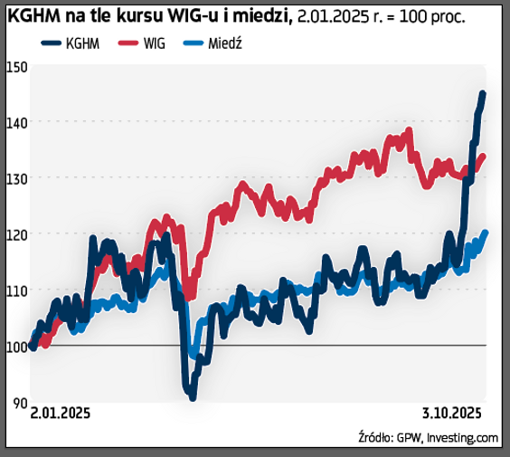 KGHM, producent miedzi ale też srebra i złota, to lokomotywa rynku ostatnich dwóch tygodni. Kurs akcji firmy wzrósł w tym czasie o około 26 proc., a WIG zyskał 2,2 proc. Dzięki tej ostatniej poprawie notowań, walory KGHM od początku roku do ostatniego piątku zwyżkowały już o około 45 proc., podczas gdy szeroki indeks giełdy poszedł w górę o około 34 proc. Jeszcze korzystniej prezentują się tegoroczne notowania lubińskiego koncernu na tle zmieniających się cen miedzi. Surowiec na giełdzie LME podrożał dotychczas tylko o około 20 proc.