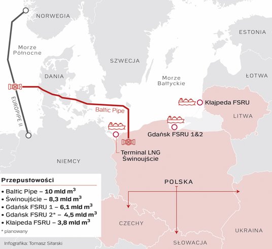 Dlatego przed laty podjęto decyzję o zbudowaniu terminalu LNG w Świnoujściu, który został uruchomiony pod koniec 2015 roku Jego moce pierwotnie wynosiły około 5 mld m sześc. rocznie, następnie siedem lat później wzrosły do 6,2 mld m sześc., a w styczniu bieżącego roku zwiększono je do 8,3 mld m sześc. Następnie zdecydowano o budowie gazociągu podmorskiego Baltic Pipe, łączącego złoża gazu na szelfie norweskim z krajowym systemem przesyłowym. Przepustowość gazociągu wynosi około 10 mld m sześc. rocznie. Temat budowy Baltic Pipe podnoszony był już pod koniec lat 90., ostatecznie budowę rozpoczęto jednak dopiero w 2020 roku, inwestycja została oddana do użytku we wrześniu 2022 roku, w samą porę, bo niedługo po rozpoczęciu inwazji Rosji na Ukrainę i wywołaniu przez Rosję kryzysu energetycznego w Europie. Obecnie polski operator gazociągów przesyłowych Gaz-System realizuje projekt kolejnego terminala LNG, tym razem pływającego (FSRU), w Zatoce Gdańskiej, a także planowana jest inwestycja w drugą jednostkę pływającą w tym miejscu. Przepustowość budowanego FSRU 1 wyniesie około 6,1 mld m sześc. gazu rocznie. Terminal zostanie uruchomiony na początku 2028 r., zwiększając potencjał Polski w zakresie importu LNG.
