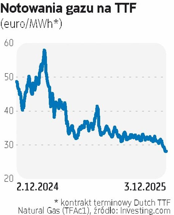 Od kilku miesięcy ceny gazu ziemnego na europejskich giełdach znajdują się w trendzie spadkowym. Obecnie na kluczowej platformie TTF kontrakty z dostawą na najbliższą zimę kształtują się na poziomie 27–28 euro za 1 MWh. Dla porównania, rok temu błękitnym paliwem handlowano tam po ponad 48 euro, a w lutym jego ceny sięgały nawet 58 euro.