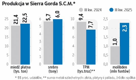 W samym III kwartale przychody Sierra Gorda S.C.M. (przeliczone na 55 proc. udziałów grupy KGHM) wzrosły do 1059 mln zł z 938 mln zł zanotowanych rok wcześniej. W ich strukturze 75 proc. wpływów zapewniła sprzedaż miedzi, 14 proc. molibdenu, 9 proc. złota i około 3 proc. srebra. Z kolei skorygowany zysk EBITDA wzrósł do 723 mln zł z 515 mln zł. Poza wysokimi przychodami o jego poziomie zdecydowały niższe o 87 mln zł koszty podstawowej działalności operacyjnej pomniejszone o amortyzację.