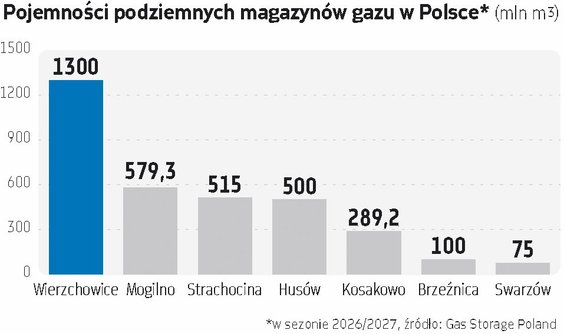 W obecnym sezonie 2025/2026 łączna pojemność czynna krajowych magazynów gazu wysokometanowego zarządzanych przez Gas Storage Poland wynosi prawie 3,31 mld m sześc. W sezonie 2026/2027 ma wzrosnąć do niespełna 3,36 mld m sześc. Z kolei po zakończeniu rozbudowy PMG Wierzchowice sięgnie około 4,1 mld m sześc.