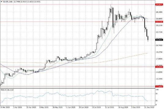 Ostatnie dni na rynku srebra są wyjątkowo emocjonujące. Ceny tego kruszcu ugięły się bowiem pod naciskiem siły amerykańskiego dolara i powiązanej z nią przeceny na rynku złota. W rezultacie, już w poniedziałek notowania srebra zniżkowały o 10% i pokonały w dół wsparcie w okolicach 26 USD za uncję. W późniejszych dniach spadki się pogłębiły – wczoraj cena srebra zniżkowała o imponujące 6% i dzisiaj kontynuuje przecenę. Obecnie notowania srebra oscylują w okolicach 22 USD za uncję, co jest najniższym poziomem od dwóch miesięcy.
