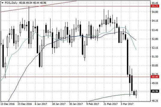 W minionym tygodniu notowania ropy naftowej gwałtownie spadły, wybijając się dołem z niemal trzymiesięcznej konsolidacji. Cena amerykańskiej ropy naftowej WTI zeszła wyraźnie poniżej poziomu 50 USD za baryłkę i w piątek dotarła do wsparcia w okolicach 48,80 USD za baryłkę, czyli bieżącego poziomu 200-sesyjnej średniej ruchomej na wykresie tego surowca. Dzisiaj rano poziom ten jest testowany jako bariera dla strony podażowej, czego rezultatem jest delikatne odbicie cen ropy naftowej w górę.