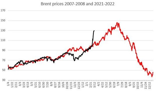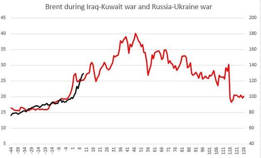 Kiedy Irak zaatakował Kuwejt, ilość ropy, która została „zamrożona" to ok. 4,5 mln brk na dzień, czyli 7-8% ówczesnej podaży (USA nałożyły embargo na iracką ropę). Teoretycznie obecna sytuacja jest bardzo podobna, choć realnie ilość zagrożonej ropy jest mniejsza, ale skoncentrowana na Europie. Ceny wzrosły wtedy w krótkim okresie nawet o 140%, ale w perspektywie mniej niż 1 roku spadły do podobnych poziomów jak przed wojną.