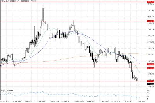 Dane dotyczące inflacji w Stanach Zjednoczonych (odczyt inflacji CPI za czerwiec w USA na poziomie 9,1% rdr, najwyżej od ponad 40 lat) rozbudziły oczekiwania podwyżki stóp procentowych w tym kraju nawet o pełen punkt procentowy (100 pkt. bazowych) jeszcze w lipcu. Możliwość pojawienia się jeszcze bardziej jastrzębiego podejścia Fed do polityki monetarnej wywarła presję na siłę amerykańskiego dolara, która z kolei negatywnie wpłynęła na ceny złota. Obecnie notowania złota zbliżyły się do kolejnej technicznej bariery, na poziomie 1700 USD za uncję.