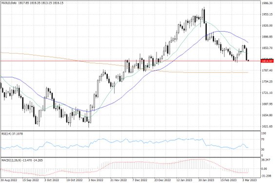 Te słowa przełożyły się na wyraźny wzrost wartości amerykańskiego dolara, co z kolei przełożyło się negatywnie na notowania wielu surowców, ze złotem na czele. Cena żółtego kruszcu, która rozpoczynała wczorajszą sesję powyżej poziomu 1850 USD za uncję, zakończyła ją w okolicach 1817 USD za uncję, czyli w rejonie lokalnych minimów z końcówki lutego.