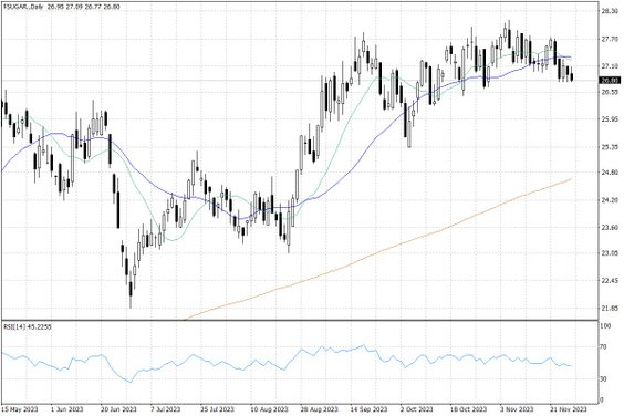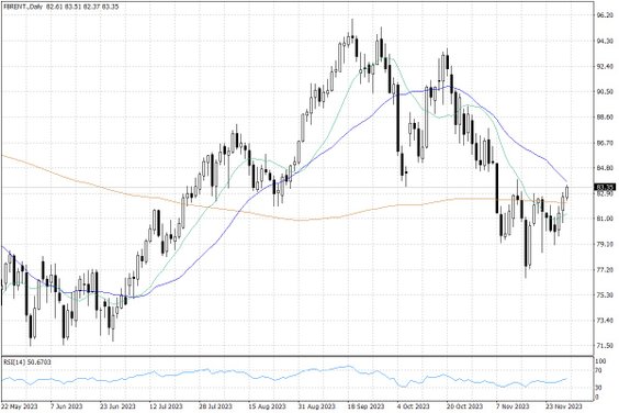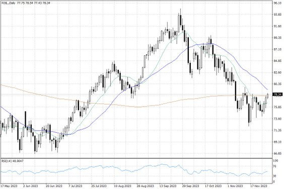 Ostatnie dni na wykresie cen ropy naftowej są wzrostowe, co sugeruje, że inwestorzy liczą się co najmniej z możliwością utrzymania dotychczasowych cięć produkcji ropy naftowej. Warto wspomnieć, że nie chodzi tu tylko o oficjalne limity OPEC+, lecz także dodatkowe dobrowolne cięcia produkcji ropy naftowej w Arabii Saudyjskiej (wynoszące milion baryłek dziennie), jak również nadprogramowe cięcia eksportu ropy z Rosji (300 tys. baryłek dziennie). Na razie wszelkie porozumienia są zawarte do końca bieżącego roku, więc spodziewane jest ich przedłużenie przynajmniej na część kolejnego roku.