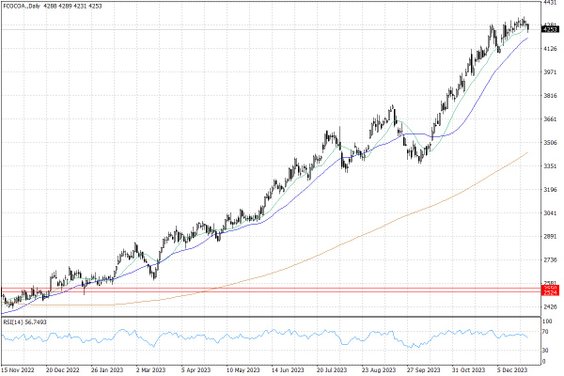 Były jednak wyjątki. Najbardziej spektakularny wzrost cen w mijającym roku zaliczyły kontrakty na kakao. Notowania tego towaru zwyżkowały aż o 72%, osiągając rekordy niewidziane od kilku dekad (a dokładniej od 46 lat). Wszystko za sprawą szoku podażowego na tym rynku. Produkcja kakao jest skoncentrowana w Afryce Zachodniej, gdzie w tym roku spora część upraw kakaowca została wyniszczona chorobami. Podaż kakao nadal jest ograniczona, a konsumpcja pozostaje wysoka – co sprawia, że fundamentalnie ulgą dla tego rynku będą dopiero kolejne zbiory, przewidziane na październik 2024 roku.