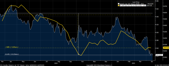 Średnia cena benzyny 95 znajduje się obecnie na poziomie 6 zł za litr. Oczywiście poziom cenowy będzie się różnił w zależności od regionu Polski. W zeszłym roku ta średnia cena wynosiła na Święta 6,5 zł za litr. Wobec tego za paliwo zapłacimy średnio przynajmniej niecałe 8% mniej niż rok temu. Co więcej, z każdym dniem ceny na stacjach powinny spadać, biorąc pod uwagę obecne fundamenty na rynku ropy naftowej. Cena baryłki ropy Brent z perspektywy rocznej, licząc w polskim złotym spadła aż o 30%! Rok temu notowana była po ok. 350 zł za baryłkę, natomiast obecnie jest to 243 złote za baryłkę. Jest to efekt ogromnej niepewności globalnej dotyczącej wzrostu gospodarczego, biorąc pod uwagę duże ograniczenia handlowe spowodowane cłami oraz przywracaniem produkcji ropy przez kartel OPEC+. Ważnym czynnikiem jest również słabość dolara i siła polskiej waluty. Złoty w pewnym momencie był najsilniejszy w stosunku do dolara od 2021 roku.