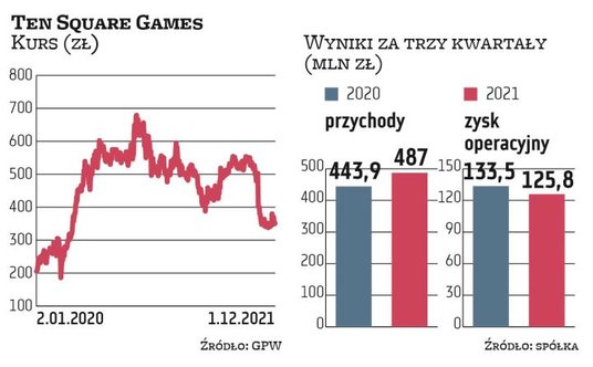 Notowania tego ostatniego w czwartek spadały o prawie 5 proc., do 27,7 zł. Okolice 27 zł to najniższy poziom od czasu tegorocznego debiutu spółki na GPW. Od ceny sprzedaży akcji w IPO kurs rynkowy jest niższy aż o 45 proc. Z kolei walory Ten Square Games po kilkuletnim wzroście w tym roku zaczęły tanieć. Przecena przybrała na sile w ostatnich tygodniach. Od maksimum z jesieni 2020 r. kurs jest niższy o połowę.