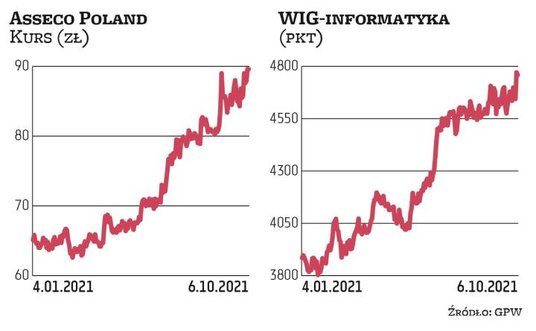 Notowania Asseco od kilku dni oscylują w okolicach wieloletniego maksimum. W środę po południu kurs przebił poziom 90 zł. W ciągu ostatnich 12 miesięcy poszedł w górę o 36 proc. Jest powyżej średniej ceny docelowej z ostatnich rekomendacji. Notowaniom pomagają dobre wyniki finansowe będące m.in. pokłosiem przyspieszonej przez pandemię cyfryzacji.