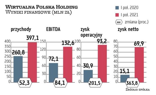 Nawet 131,4 zł, 9,5 proc. więcej niż na poniedziałkowym zamknięciu, kosztowała we wtorek akcja Wirtualnej Polski Holding na warszawskiej giełdzie. Przy tym kursie grupa, która zarabia na kampaniach reklamowych w internecie i pośredniczeniu w sprzedaży produktów popularnych wśród internautów kategorii, kontrolowana przez trzech Polaków, w tym prezesa Jacka Świderskiego, warta była już ponad 3,8 mld zł.