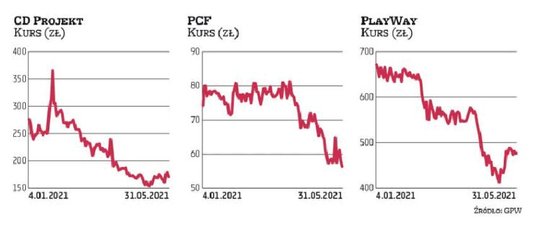 WIG.GAMES był w poniedziałek jednym z najsłabszych indeksów na GPW. Po południu spadał o ponad 2 proc. Taniały wszystkie tworzące go spółki: Cl Games (-3 proc.), CD Projekt (-2 proc.),PlayWay (-2 proc.), Ten Square Games (-1 proc.) oraz 11 bit studios (-0,6 proc.). W przypadku CI Games inwestorzy odliczają już dni do premiery „Sniper Ghost Warrior Contracts 2". Zaplanowano ją na 4 czerwca. Z kolei w CD Projekcie kurs spadał w oczekiwaniu na słabe wyniki za I kwartał 2021 r. Miały trafić na rynek w poniedziałek. Do czasu zamknięcia tego wydania gazety nie zostały opublikowane.