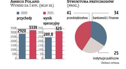 W I kwartale 2021 r. Asseco Poland wypracowało ponad 3,3 mld zł przychodów, czyli o 14 proc. więcej niż w analogicznym okresie ubiegłego roku. Sprzedaż własnych produktów i usług informatycznych wyniosła 2,6 mld zł, co stanowiło 78 proc. wszystkich przychodów. Skonsolidowany zysk operacyjny wzrósł o 29 proc., do 323 mln zł. Z kolei zysk netto przypisany akcjonariuszom jednostki dominującej sięgnął 102 mln zł i był o 25 proc. wyższy niż rok temu. Był zbliżony do szacunków opublikowanych wcześniej przez spółkę. W trakcie I kwartału grupa poprawiła wyniki we wszystkich segmentach operacyjnych. W Formula Systems sprzedaż wzrosła o 16 proc., do 2,2 mld zł, a zysk operacyjny o 31 proc., do 167 mln zł. Przychody segmentu Asseco International zwiększyły się o 9 proc., do 819 mln zł, a zysk operacyjny o 21 proc., do 98 mln zł. Z kolei w segmencie Asseco Poland sprzedaż wyniosła 367 mln zł, czyli o 18 proc. więcej niż rok temu, a zysk operacyjny poszedł w górę o 38 proc., do 59 mln zł. W I kwartale za 89 proc. przychodów grupy odpowiadały rynki zagraniczne (reprezentowane przez segmenty Formula Systems i Asseco International). Jeśli przeanalizowalibyśmy relację zysku do przychodów, jakie wypracowują poszczególne segmenty, to okazuje się, że najwyższą rentownością może się pochwalić Asseco Poland, a relatywnie najniższe marże w I kwartale miała Formula.