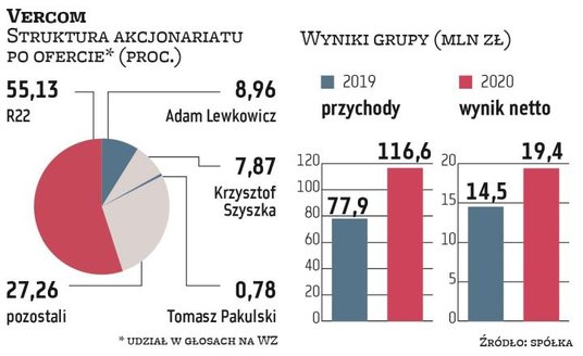 Vercom należy do grupy giełdowego R22. W ramach trwającego IPO do kupienia jest 4 mln nowych akcji serii D. Dodatkowo w skład oferty wchodzi nie więcej niż 500 tys. walorów zbywanych przez prezesa Krzysztofa Szyszkę oraz nie więcej niż 500 tys. przez wiceprezesa Adama Lewkowicza. Łącznie sprzedawane akcje stanowią 6,91 proc. kapitału. Spółka, akcjonariusze sprzedający oraz główny akcjonariusz (czyli R22) zawarli umowę lockupu na 12 miesięcy od dnia debiutu giełdowego.