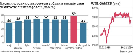 Na GPW są notowane 52 studia tworzące gry. To o pięć więcej niż na giełdzie w Tokio, która jeszcze kilka miesięcy temu zajmowała w statystykach dotyczących liczebności firm z tej branży pierwsze miejsce na świecie. Inną sprawą jest kapitalizacja, bo na naszym rynku dominują spółki małe i średnie. Kilka miesięcy temu studia na GPW były łącznie wyceniane na ponad 50 mld zł, ale za niemal 80 proc. tej sumy odpowiadał CD Projekt. Po premierze „Cyberpunka 2077" i drastycznej przecenie akcji spółki sytuacja się zmieniła. Teraz łączna wycena twórców gier sięga 43 mld zł, w tym 63 proc. przypada na CD Projekt.