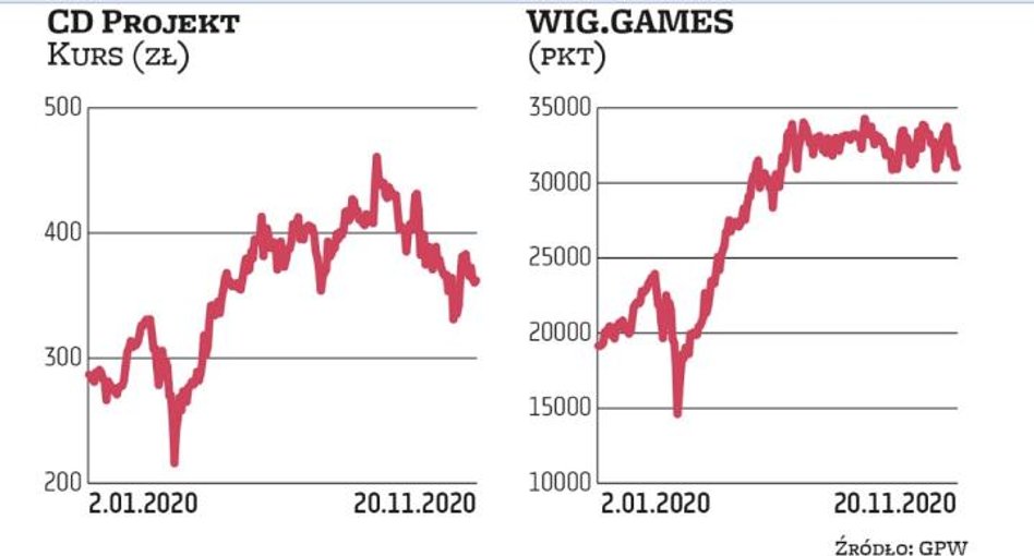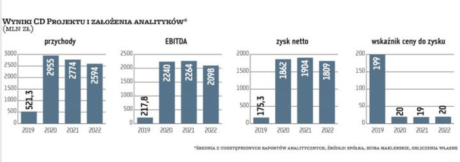 Natomiast obniżyli (po trzecim przełożeniu premiery) szacunki dotyczące sprzedaży gry w samym 2020 r. o kilkanaście procent, średnio do niespełna 20 mln. Ścięcie prognoz na ten rok nie jest zaskoczeniem, bo za sprawą przesunięcia premiery na 10 grudnia z 19 listopada okres sprzedaży w 2020 r. skrócił się aż o połowę – z sześciu tygodni do trzech. Premiera zaowocuje bardzo mocnym wzrostem zysku netto spółki i będzie to widoczne już w tym roku. W 2019 r. zarobek netto studia, napędzany sprzedażą „Wiedźmina" (któremu z kolei pomagał serial Netflixa), wyniósł 175 mln zł. Średni zakładany przez analityków zysk na ten rok jest ponad dziesięć razy wyższy. W 2021 r. może pójść w górę jeszcze mocniej, do prawie 2 mld zł, by w 2022 r. nieznacznie spaść do około 1,8 mld zł. Zwyżka zysku przełoży się na bardzo mocny spadek wskaźnika C/Z , który obecnie dla CD Projektu jest aż trzycyfowy. Przy prognozach na 2020 r., 2021 r. i 2022 r. spada w okolice 19–20. Implikuje to dwucyfrowe (w okolicach 20–30 proc.) dyskonto w wycenie firmy w stosunku do spółek porównywalnych.