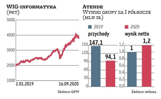 W skład WIG-informatyka wchodzą też m.in. Comarch (jego portfel zamówień na 2020 r. jest wyższy o 7–8 proc. od notowanego przed rokiem), DataWalk, Comp, PGS Software, Sygnty oraz Atende. W środę pozytywnie wyróżniała się ta ostatnia spółka. Jej akcje po południu zyskiwały prawie 5 proc. Była to reakcja na wyniki za I półrocze.