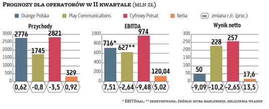Zaczyna się okres publikacji wyników za II kwartał br. przez spółki należące do najbardziej interesujących inwestorów sektorów – telekomunikacji. Jako pierwsza już w tym tygodniu dane pokaże grupa Orange Polska. Średnia prognoz 11 biur maklerskich zebranych przez nas wskazuje, że telekom ten zanotować mógł w tym czasie 2,78 mld zł przychodów, 716 mln zł EBITDAal (zysk operacyjny powiększony o amortyzację i koszty leasingu) i 50 mln zł zysku netto. W porównaniu z wynikami sprzed roku oznacza to odpowiednio wzrost o 0,6 proc., 7,5 proc. i spadek o ponad 9 proc. Wzrost EBITDAal to jednak efekt rozwiązania rezerwy na koszty wynagrodzeń pracowniczych.