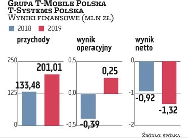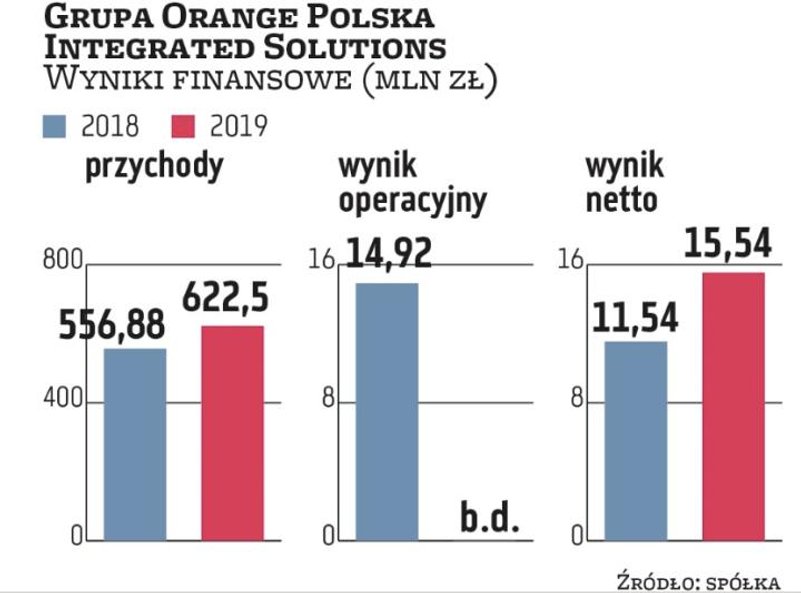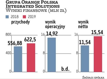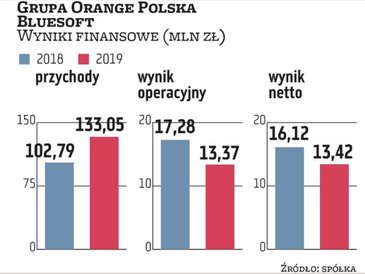 Drugą pod względem przychodów firmą IT należącą do Orange Polska jest Bluesoft. W minionym roku wypracował nieco ponad 133 mln zł przychodu, czyli o 21 mln zł więcej niż w roku 2018. Wzrosły wpływy z umów z bankami i stanowiły 44 proc. obrotu. Natomiast zyski się obniżyły. Wynik operacyjny były niższy niż rok wcześniej o 4 mln zł i zamknął się sumą 13,3 mln zł, a na czysto zarobiła 13,4 mln zł, o 2,7 mln zł mniej niż w 2018 r. To dane ze sprawozdania opublikowanego w KRS. Zarząd Bluesoft, pod kierunkiem Wojciecha Pawińskiego napisał, że na ten rok planuje wzrost przychodu do ponad 140 mln zł. Plan na ten rok zakłada m.in. rozwój za granicą, walkę o klientów w segmencie farmaceutycznym i ubezpieczeniowym. Firma chce też zwiększyć zatrudnienie do ponad 700 osób.