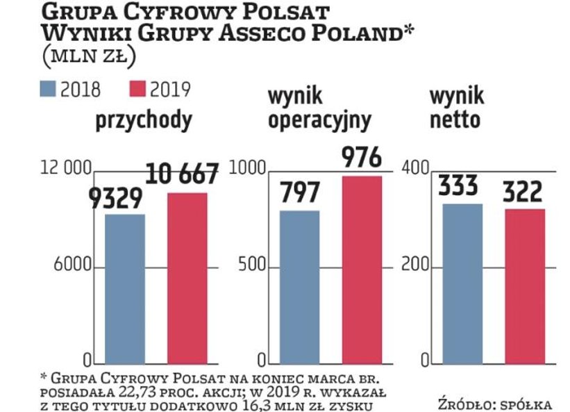 Jeśli spojrzeć na zyski z IT, to Cyfrowy Polsat może zaliczyć inwestycję w Asseco do udanych. Zdaniem analityków ta spółka w tym roku poprawi wyniki. – Zakładamy 4-proc. wzrost zysków Asseco Poland rok do roku dzięki spodziewanym wyższym przychodom w Polsce – mówi Łukasz Kosiarski, analityk w Biurze Maklerskim Banku Pekao. To właśnie m.in. umowa z Cyfrowym Polsatem czy kontrakty w administracji publicznej i dodatkowe przychody ZUS związane z implementacją tarcz antykryzysowych będą w tym pomocne – przewiduje analityk. Jego zdaniem, jeśli zobaczymy synergie wynikające z tego, że Asseco, Cyfrowy Polsat i Netia tworzą grupę, to nie będą one duże.