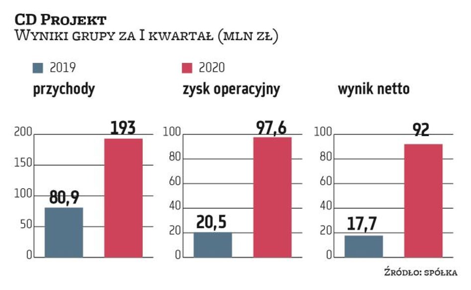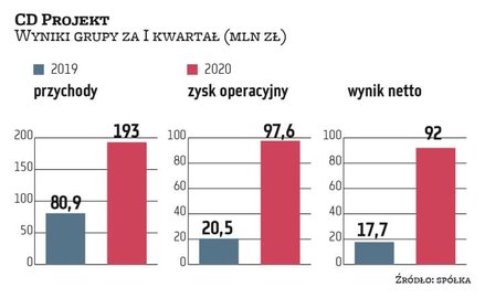 W I kwartale 2020 r. przychody CD Projektu urosły do niemal 193 mln zł z niespełna 81 mln zł. Zysk z działalności operacyjnej wzrósł do 97,6 mln zł z 20,5 mln zł. Zysk netto poszedł w górę do prawie 92 mln zł z 17,7 mln zł. Bardzo dużą poprawę widać też na poziomie przepływów operacyjnych. Na koniec marca wynosiły 187 mln zł. W 2019 r. grupa CD Projektu miała 521 mln zł przychodów.