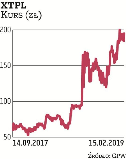 W piątek po południu za akcję XTPL trzeba było zapłacić 192 zł. Spółka zajmuje się nanodrukiem. Inwestorzy najwyraźniej mocno wierzą w jej biznes, bo od czasu debiutu na NewConnect (jesień 2017 r.) akcje podrożały trzykrotnie. Firma duże nadzieje pokłada w rozwoju na rynkach zagranicznych. Zarząd nie ukrywa, że liczy na wzrost zainteresowania spółką po przeprowadzce na rynek główny. Już teraz ma ona w akcjonariacie zagraniczne instytucje finansowe.