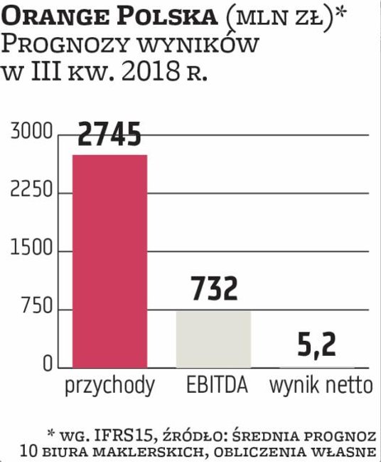 Nie można tych liczb zestawić w odpowiedzialny sposób z danymi operatora przed rokiem, gdy stosował standard IAS 18. Natomiast w zestawieniu z pierwszymi dwoma kwartałami br. minione trzy miesiące, obejmujące okres wakacji i pierwszy miesiąc roku szkolnego mogły przynieść Orange Polska nieco wyższe przychody (wobec 2,71 mld zł w I kwartale i podobnej kwoty w II kwartale br.), wyższą EBITDA oraz pierwszy raz w tym roku – dodatni wynik netto.