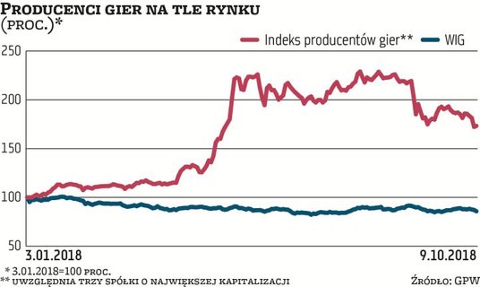 Nawet po ostatniej przecenie stopy zwrotu z akcji producentów gier prezentują się imponująco. Trzy największe spółki, czyli CD Projekt, PlayWay i 11 bit studios, w tym roku podrożały średnio o 73 proc. Wygrywają z rynkiem o 87 pkt proc. Zdaniem analityków szanse na dalszą zwyżkę nadal istnieją.