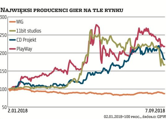 Jeszcze wcześniej zaczęła się korekta na akcjach globalnych producentów gier, co nie pozostaje bez wpływu na notowania rodzimych studiów. Te dolały jeszcze oliwy do ognia – 11 bit studios i CI Games rozczarowały wynikami, nowa gra PlayWaya nie okazała się hitem, a w Vivid Games pretekstem do spadków była sprzedaż akcji przez zarząd. Tylko od końca sierpnia akcje notowanych na GPW spółek z branży gier potaniały średnio o ponad 20 proc., a to umowna granica bessy. Eksperci nie chcą przesądzać, czy z taką właśnie sytuacją mamy do czynienia w sektorze, ale nie kryją, że wyceny studiów są wysokie. Widać to również w rekomendacjach – zamiast zaleceń kupna w ostatnich dniach na rynek trafiają raporty o treści „trzymaj" lub „neutralnie".