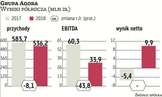 W II kwartale br. Grupa Agory, do której oprócz sieci kin Helios należy dziennik „Gazeta Wyborcza", firma reklamy zewnętrznej AMS, radiostacje i portale, odnotowała 258,3 mln zł przychodu (spadek o 8,6 proc. rok do roku), 2,4 mln zł straty EBITDA oraz 0,2 mln zł zysku netto. Analitycy ankietowani przez PAP spodziewali się niemal takich właśnie przychodów, ale mniejszej straty EBITDA (1,4 mln zł) oraz kilku milionów straty netto po tym, jak firma zapowiedziała dodatkowy odpis na należności od kontrahenta (chodzi o Ruch).